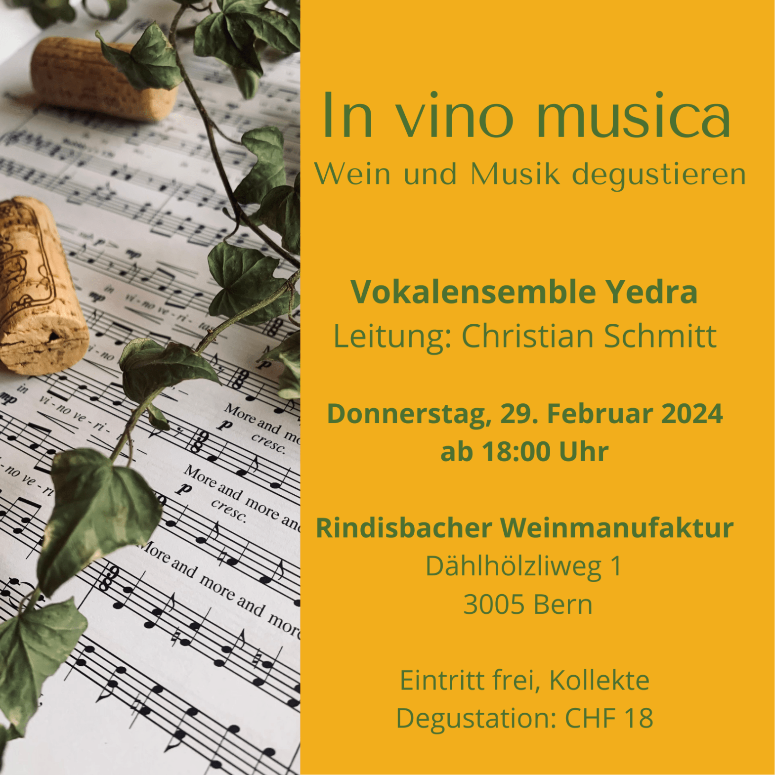Erlebt die harmonische Verbindung von Wein und Musik bei «In vino musica», einer exquisiten Degustationsveranstaltung mit dem Vokalensemble Yedra unter der Leitung von Christian Schmitt. Diese einzigartige Begegnung der Sinne findet am Donnerstag, den 29. Februar 2024, in unserem Weinkeller am Dählhölzliweg 1in Bern statt. Ab 18 Uhr erwarten euch ein Abend, der eure Gaumen …